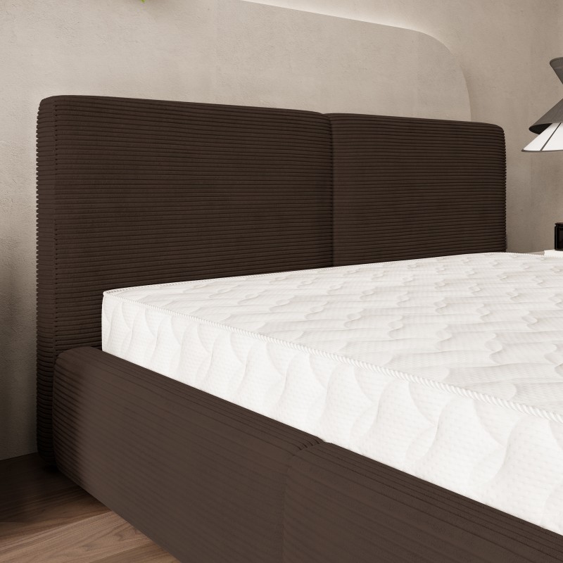 Łóżko FELURO w tkaninie POSO to mebel, który doskonale łączy nowoczesną estetykę z ponadczasowym sztruksem. Solidna bryła z masywnymi, miękko wykończonymi bokami emanuje stabilnością, a jednocześnie pozostaje przyjemna i bezpieczna w dotyku. FELURO wyróżnia się prostą, minimalistyczną formą, która sprawia, że pasuje zarówno do eleganckich, jak i bardziej przytulnych aranżacji sypialni.
