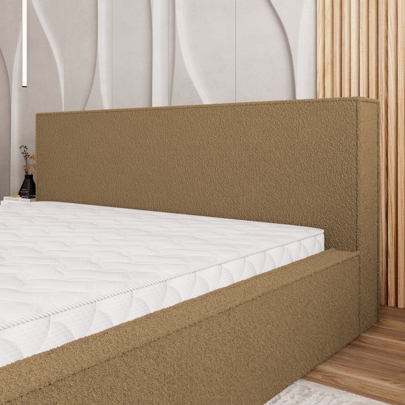 - Obicie wykonano z modnej tkaniny bouclé, której pętelkowa struktura jest zarówno wyrazista, jak i przyjemna w dotyku. Materiał ten dodaje wnętrzu ciepła i nowoczesnego charakteru, sprawiając, że łóżko staje się centralnym punktem pomieszczenia.