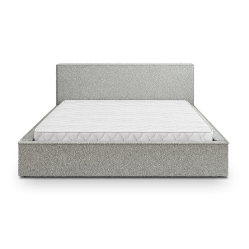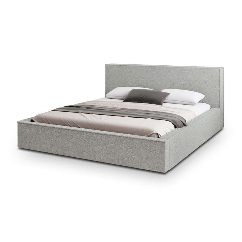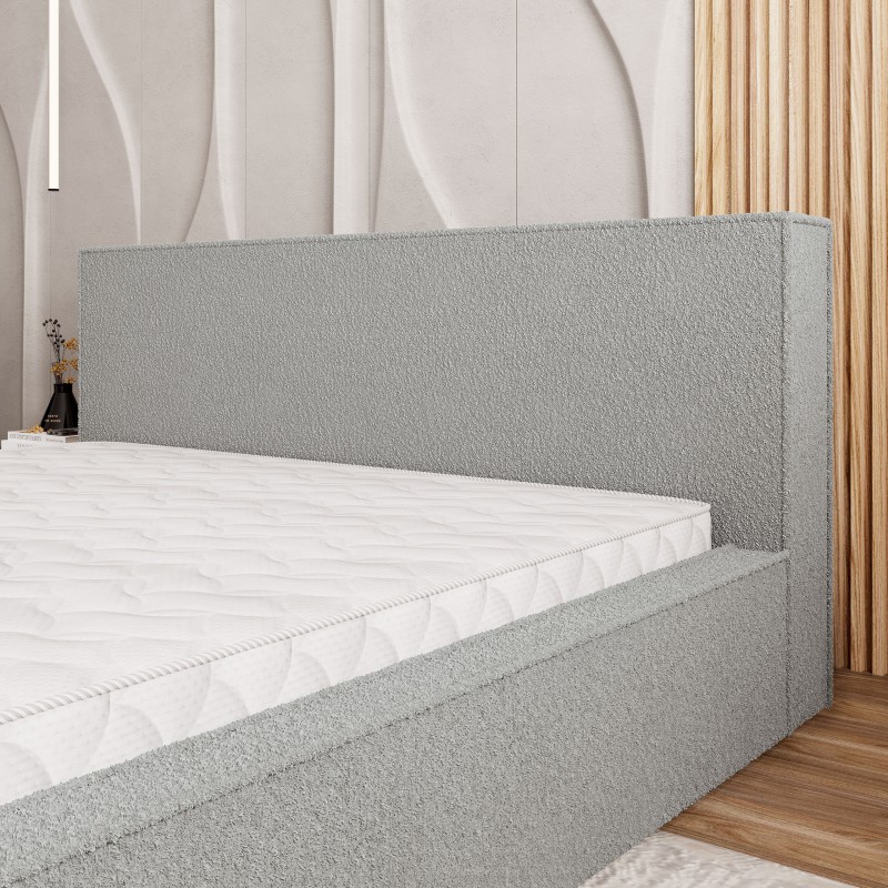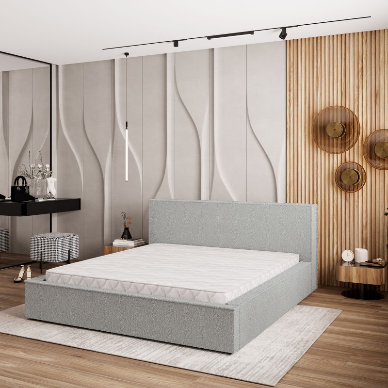 - Obicie wykonano z modnej tkaniny bouclé, której pętelkowa struktura jest zarówno wyrazista, jak i przyjemna w dotyku. Materiał ten dodaje wnętrzu ciepła i nowoczesnego charakteru, sprawiając, że łóżko staje się centralnym punktem pomieszczenia.
