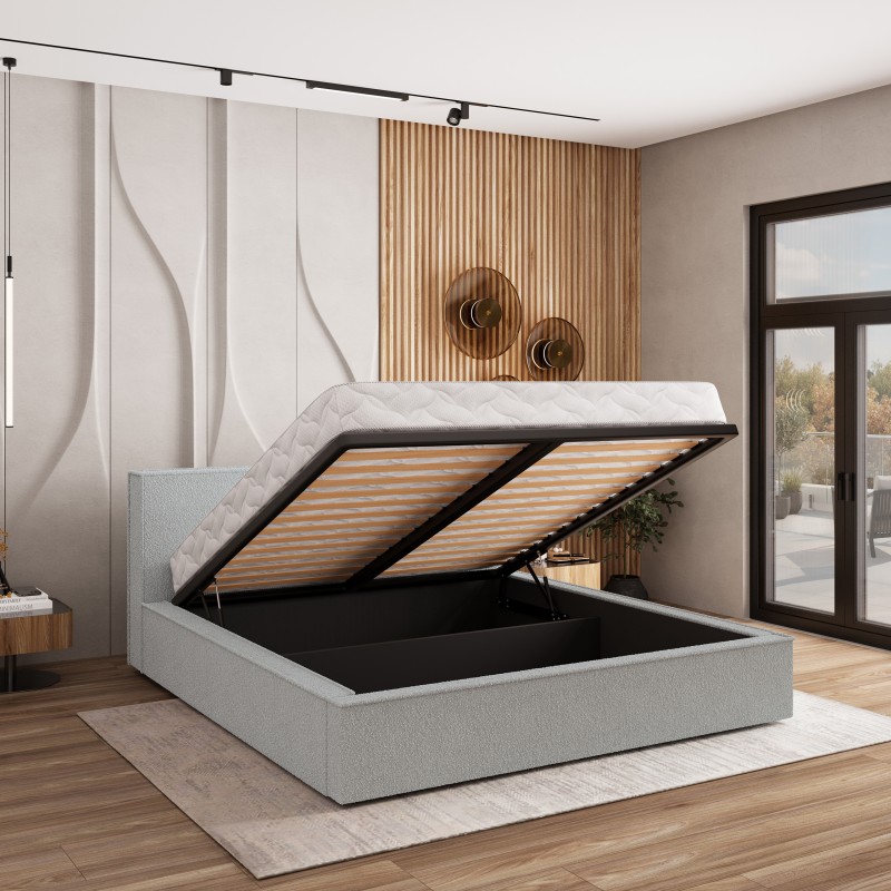 Quelle to miękka, modna bouclé o wyrazistej pętelkowej strukturze. Jej faktura przyciąga wzrok i dodaje wnętrzu ciepła, a jednocześnie pozostaje wierna nowoczesnym trendom. To materiał, który sprawia, że CELORA staje się czymś więcej niż tylko miejscem do spania – staje się centralnym punktem sypialni, który wprowadza do niej nutę świeżości i modnej lekkości. Praktyczność również odgrywa tu swoją rolę. CELORA została wyposażona w schowek na pościel otwierany za pomocą podnoszonego stelaża. Pojemnik jest obszerny i wykończony tkaniną, co sprawia, że wnętrze łóżka wygląda estetycznie, a podłoga pod nim jest chroniona. To rozwiązanie, które czyni z CELORY mebel nie tylko piękny, ale i wyjątkowo funkcjonalny.