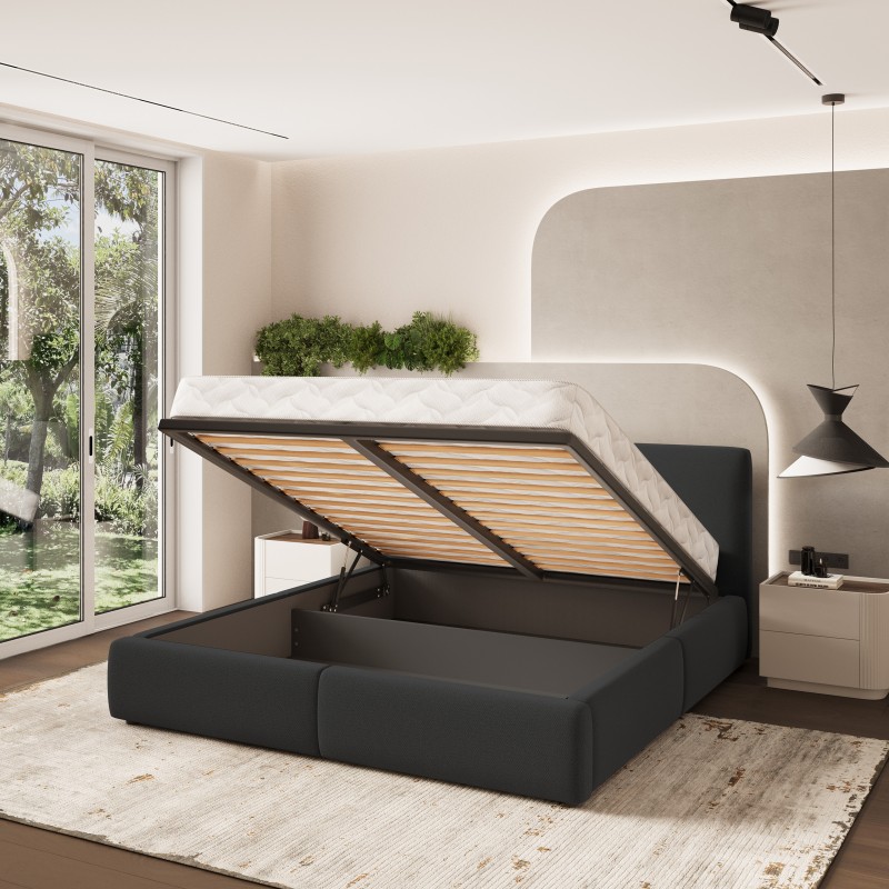 - Wyposażony w mechanizm wspomagający unoszenie, dzięki któremu dostęp do schowka jest szybki i bezproblemowy. Stelaż jest solidny, stabilny i przystosowany do różnych typów materacy.