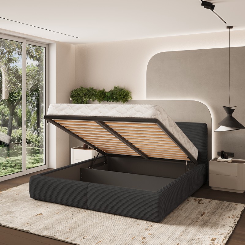 Model FELURO został wyposażony w praktyczne rozwiązania, które ułatwiają życie na co dzień. Podnoszony stelaż z mechanizmem wspomagającym unoszenie gwarantuje szybki i wygodny dostęp do pojemnego schowka na pościel z materiałowym dnem. To doskonały sposób na przechowywanie kołder, poduszek i innych tekstyliów, dzięki któremu sypialnia zawsze pozostaje uporządkowana. Prostota montażu sprawia, że łóżko jest gotowe do użytku w krótkim czasie, a stabilna konstrukcja zapewnia trwałość na lata. Obicie w tkaninie POSO nadaje całości wyrazistego charakteru. To materiał o strukturze sztruksu i ponadczasowym wyglądzie, który wyróżnia się trwałością oraz odpornością na codzienne użytkowanie. Dostępny w szerokiej palecie modnych kolorów, pozwala dopasować łóżko do indywidualnego stylu wnętrza i stworzyć aranżację idealnie odpowiadającą Twoim gustom.