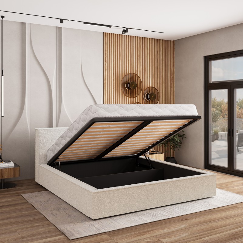Quelle to miękka, modna bouclé o wyrazistej pętelkowej strukturze. Jej faktura przyciąga wzrok i dodaje wnętrzu ciepła, a jednocześnie pozostaje wierna nowoczesnym trendom. To materiał, który sprawia, że CELORA staje się czymś więcej niż tylko miejscem do spania – staje się centralnym punktem sypialni, który wprowadza do niej nutę świeżości i modnej lekkości. Praktyczność również odgrywa tu swoją rolę. CELORA została wyposażona w schowek na pościel otwierany za pomocą podnoszonego stelaża. Pojemnik jest obszerny i wykończony tkaniną, co sprawia, że wnętrze łóżka wygląda estetycznie, a podłoga pod nim jest chroniona. To rozwiązanie, które czyni z CELORY mebel nie tylko piękny, ale i wyjątkowo funkcjonalny.