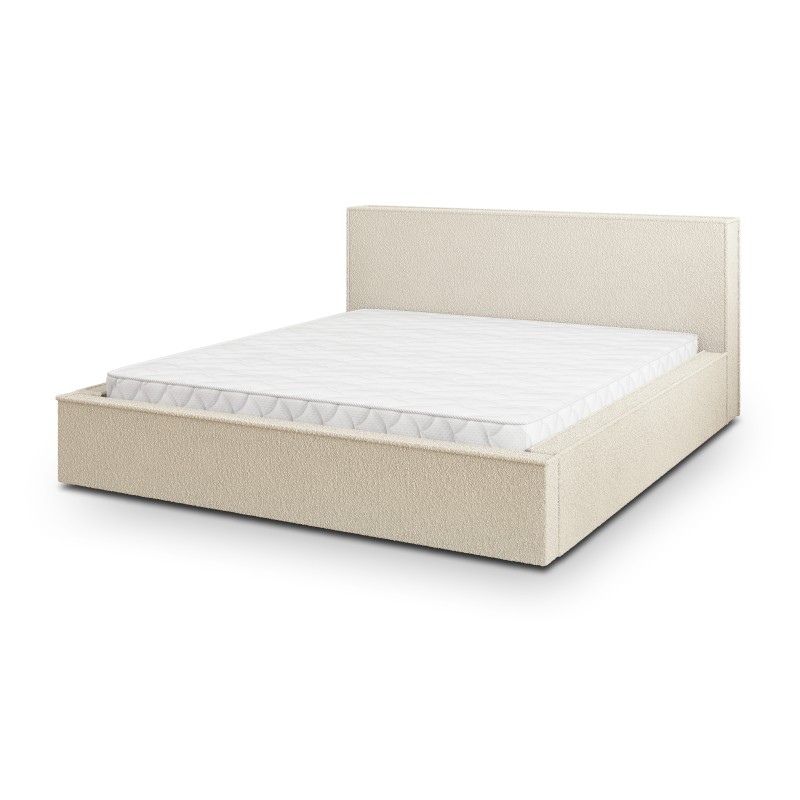- Obicie wykonano z modnej tkaniny bouclé, której pętelkowa struktura jest zarówno wyrazista, jak i przyjemna w dotyku. Materiał ten dodaje wnętrzu ciepła i nowoczesnego charakteru, sprawiając, że łóżko staje się centralnym punktem pomieszczenia.