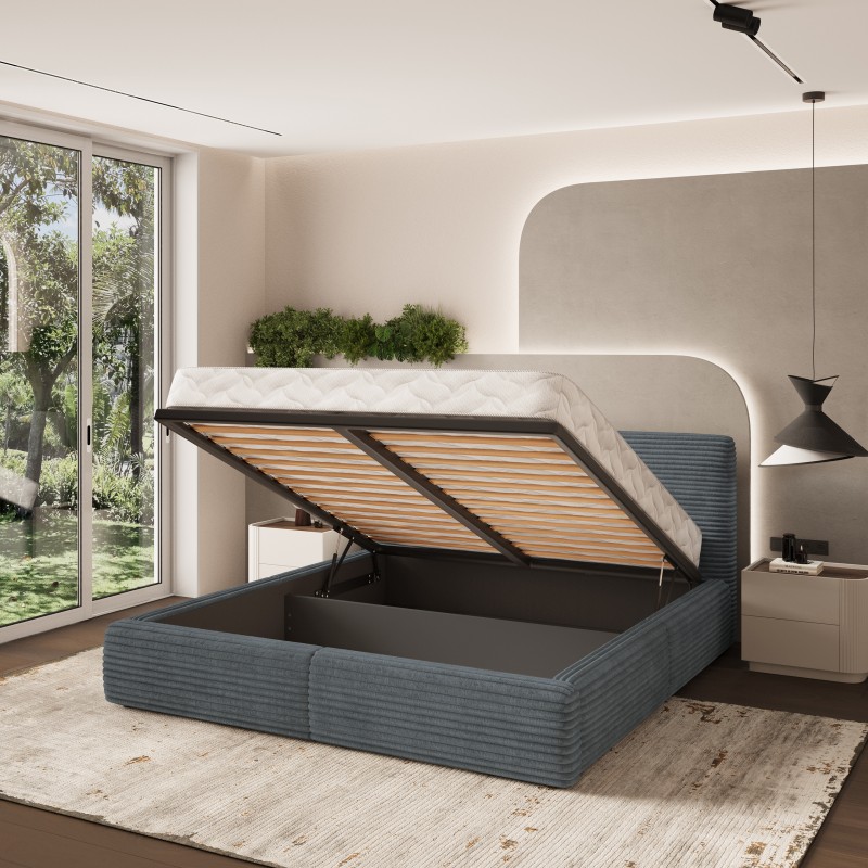 Obicie w tkaninie TILIA nadaje całości wyjątkowego charakteru. Grube prążki z miękkiego weluru sprawiają, że łóżko prezentuje się niezwykle elegancko, a jednocześnie pozostaje uniwersalne i łatwe w aranżacji. TILIA jest przyjemna w dotyku, odporna na codzienne użytkowanie i świetnie komponuje się zarówno z nowoczesnymi, jak i skandynawskimi wnętrzami. FELURO zostało zaprojektowane tak, by odpowiadać na codzienne potrzeby. Podnoszony stelaż z mechanizmem wspomagającym otwieranie, pozwala bez wysiłku dostać się do pojemnego schowka na pościel z materiałowym dnem. Dzięki temu przechowywanie kołder, poduszek i koców staje się wygodne, a sypialnia zawsze zachowuje porządek. Standardowe wymiary z pomogą Ci z łatwością dobrać idealny materac.
