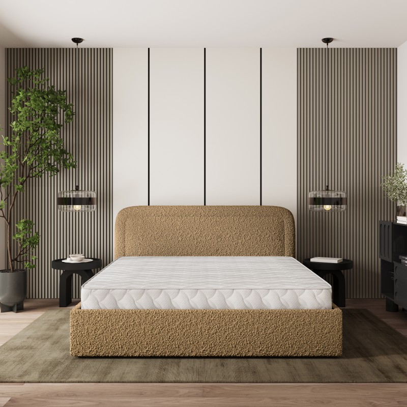 - Tapicerowany, miękki zagłówek to obietnica wyjątkowego komfortu i wysokiej jakości wypoczynku. Dzięki niemu łóżko staje się idealnym oparciem podczas wieczornej lektury czy relaksu. Całość wykończona jest przyjemną w dotyku tkaniną, nadającą modny i luksusowy wygląd.