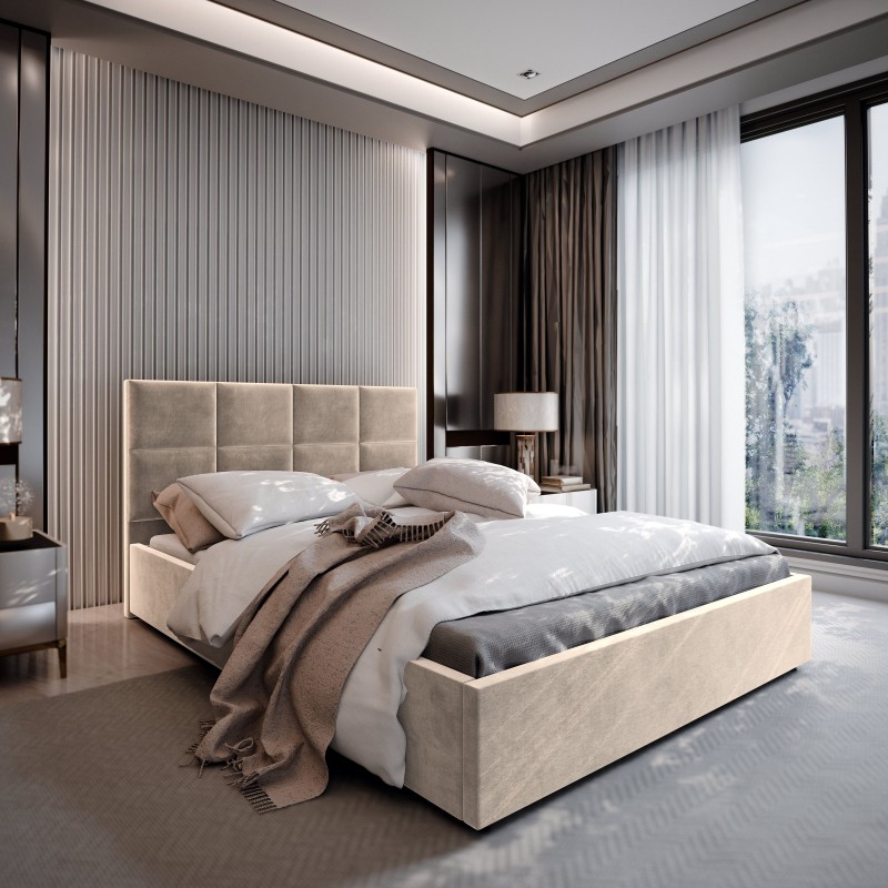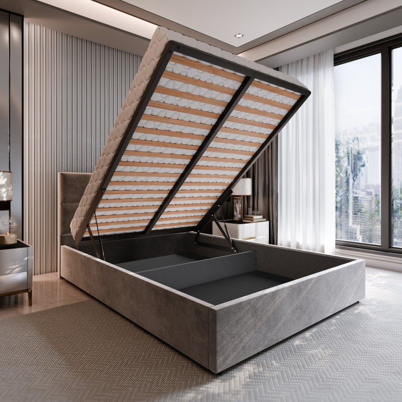 Każdy detal, od miękkiego w dotyku obicia po staranne wykończenie, został zaprojektowany, by zapewnić Ci głęboki, regenerujący sen i poczucie luksusu – każdej nocy. Wykorzystaj maksymalnie potencjał swojej sypialni dzięki praktycznym rozwiązaniom do przechowywania. Łóżko wyposażone jest w podnoszony stelaż, wspierany przez niezawodny mechanizm. Dzięki temu, dostęp do obszernego schowka na pościel jest całkowicie bezwysiłkowy.