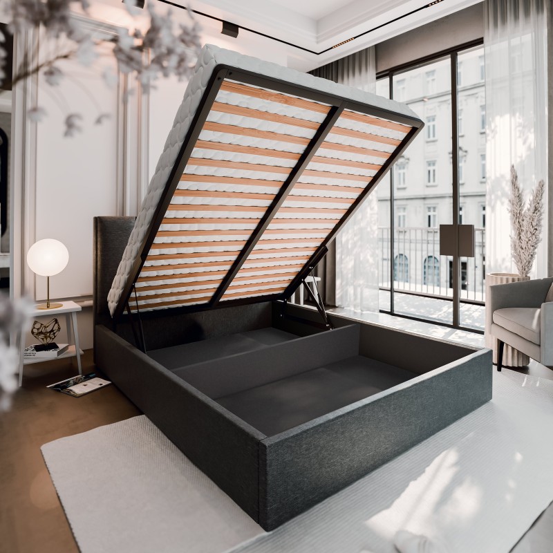 Każdy detal, od miękkiego w dotyku obicia po staranne wykończenie, został zaprojektowany, by zapewnić Ci głęboki, regenerujący sen i poczucie luksusu – każdej nocy. Wykorzystaj maksymalnie potencjał swojej sypialni dzięki praktycznym rozwiązaniom do przechowywania. Łóżko wyposażone jest w podnoszony stelaż, wspierany przez niezawodny mechanizm. Dzięki temu, dostęp do obszernego schowka na pościel jest całkowicie bezwysiłkowy.