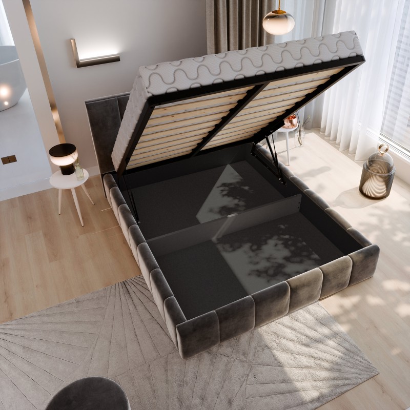 Każdy detal, od miękkiego w dotyku obicia po staranne wykończenie, został zaprojektowany, by zapewnić Ci głęboki, regenerujący sen i poczucie luksusu – każdej nocy. Wykorzystaj maksymalnie potencjał swojej sypialni dzięki praktycznym rozwiązaniom do przechowywania. Łóżko wyposażone jest w podnoszony stelaż, wspierany przez niezawodny mechanizm. Dzięki temu, dostęp do obszernego schowka na pościel jest całkowicie bezwysiłkowy.