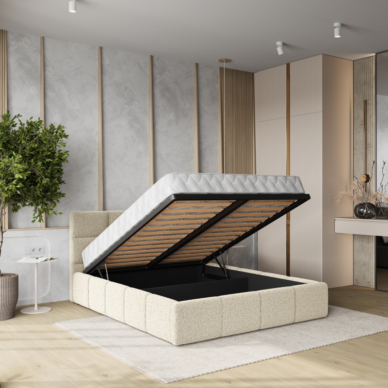 Każdy detal, od miękkiego w dotyku obicia po staranne wykończenie, został zaprojektowany, by zapewnić Ci głęboki, regenerujący sen i poczucie luksusu – każdej nocy. Wykorzystaj maksymalnie potencjał swojej sypialni dzięki praktycznym rozwiązaniom do przechowywania. Łóżko wyposażone jest w podnoszony stelaż, wspierany przez niezawodny mechanizm. Dzięki temu, dostęp do obszernego schowka na pościel jest całkowicie bezwysiłkowy.