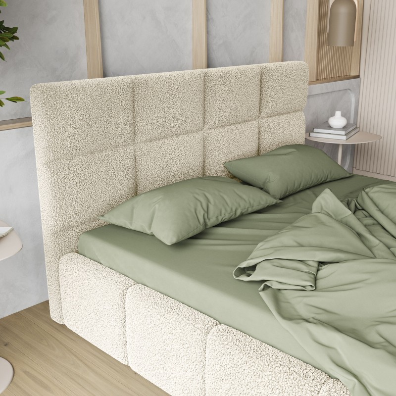 - Tapicerowany, miękki zagłówek to obietnica wyjątkowego komfortu i wysokiej jakości wypoczynku. Dzięki niemu łóżko staje się idealnym oparciem podczas wieczornej lektury czy relaksu. Całość wykończona jest przyjemną w dotyku tkaniną, nadającą modny i luksusowy wygląd.