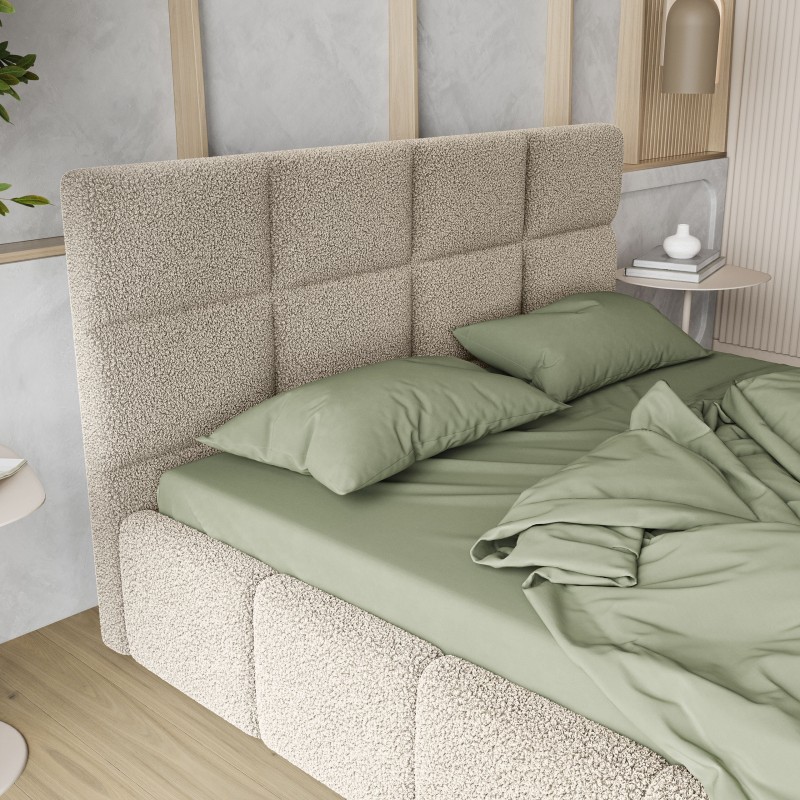 - Tapicerowany, miękki zagłówek to obietnica wyjątkowego komfortu i wysokiej jakości wypoczynku. Dzięki niemu łóżko staje się idealnym oparciem podczas wieczornej lektury czy relaksu. Całość wykończona jest przyjemną w dotyku tkaniną, nadającą modny i luksusowy wygląd.