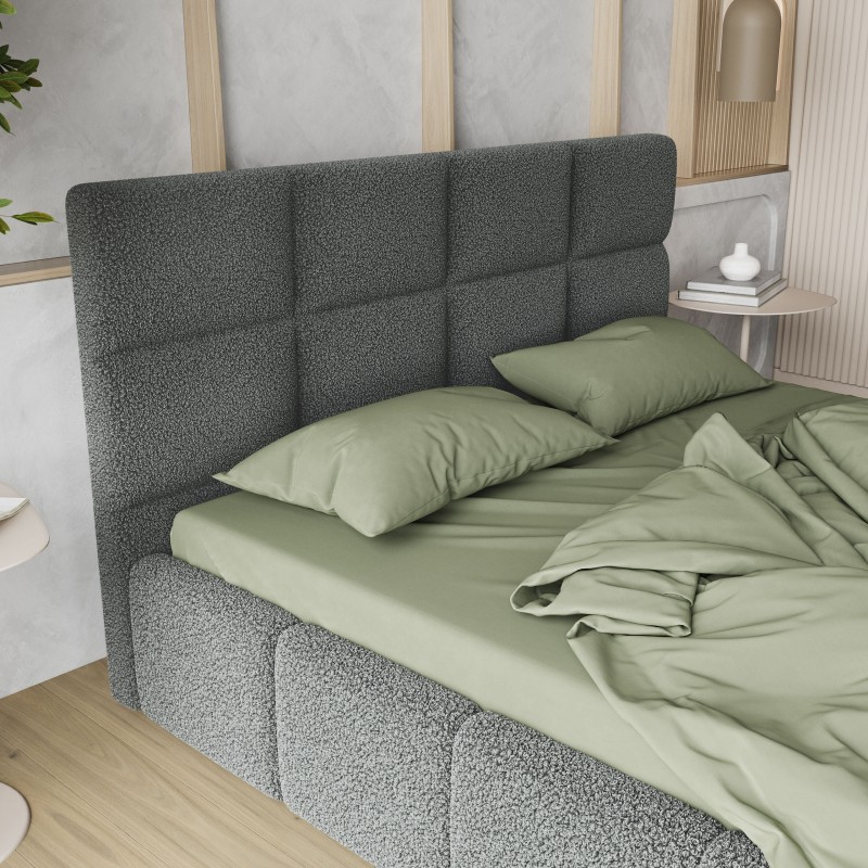 - Tapicerowany, miękki zagłówek to obietnica wyjątkowego komfortu i wysokiej jakości wypoczynku. Dzięki niemu łóżko staje się idealnym oparciem podczas wieczornej lektury czy relaksu. Całość wykończona jest przyjemną w dotyku tkaniną, nadającą modny i luksusowy wygląd.