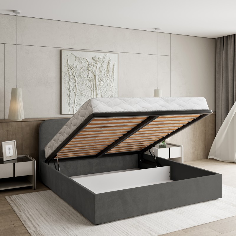 - W podstawowej cenie mebla znajduje się podnoszony stelaż z metalową ramą, wypełniają go elastyczne listwy. Taka opcja nie tylko wydłuża trwałość materaca, lecz także zapewnia większy komfort użytkowania i dodatkową przestrzeń do przechowywania pod łóżkiem.