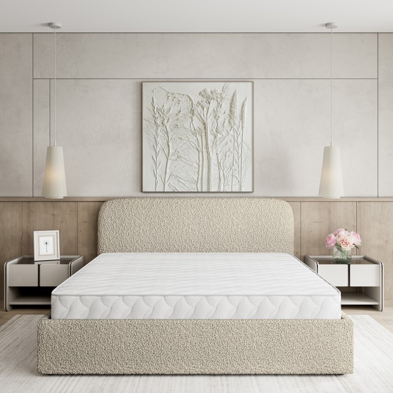 Łóżko w tkaninie QUELLE, która charakteryzuje się wyjątkową strukturą typu boucle, potocznie określaną jako „baranek”. Jej delikatna i puszysta powierzchnia wprowadza do wnętrz przytulność oraz nutę wyrafinowania, doskonale komponując się zarówno z klasycznym, jak i nowoczesnym wystrojem. Dzięki wysokiej jakości wykonania, tkanina zachowuje swoją strukturę i wygląd przez długi czas, zapewniając estetyczny efekt oraz komfort użytkowania.