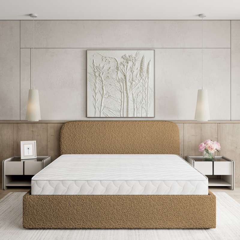 Łóżko w tkaninie QUELLE, która charakteryzuje się wyjątkową strukturą typu boucle, potocznie określaną jako „baranek”. Jej delikatna i puszysta powierzchnia wprowadza do wnętrz przytulność oraz nutę wyrafinowania, doskonale komponując się zarówno z klasycznym, jak i nowoczesnym wystrojem. Dzięki wysokiej jakości wykonania, tkanina zachowuje swoją strukturę i wygląd przez długi czas, zapewniając estetyczny efekt oraz komfort użytkowania.