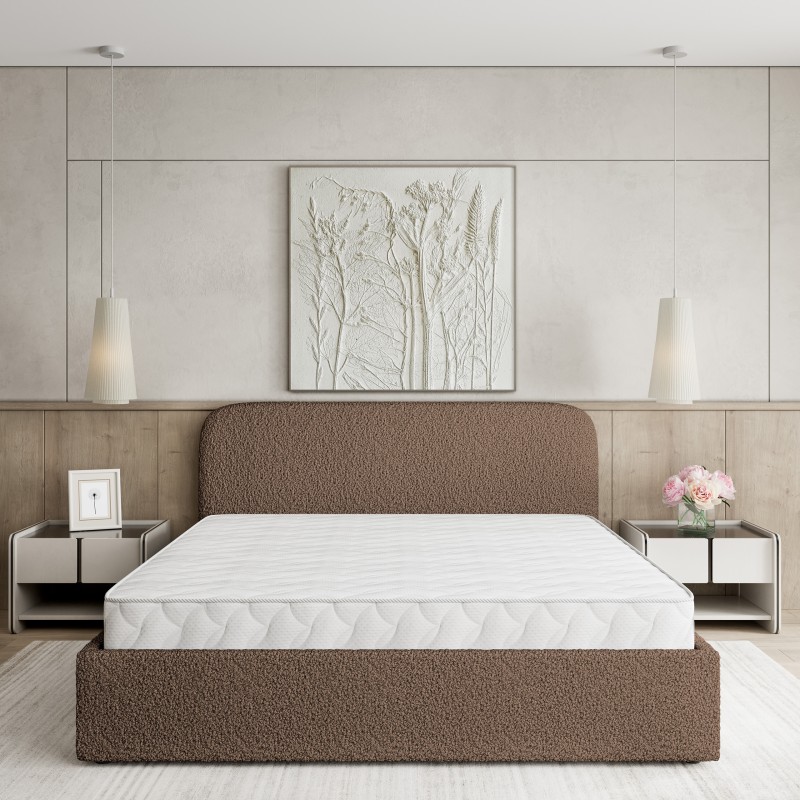 Łóżko w tkaninie QUELLE, która charakteryzuje się wyjątkową strukturą typu boucle, potocznie określaną jako „baranek”. Jej delikatna i puszysta powierzchnia wprowadza do wnętrz przytulność oraz nutę wyrafinowania, doskonale komponując się zarówno z klasycznym, jak i nowoczesnym wystrojem. Dzięki wysokiej jakości wykonania, tkanina zachowuje swoją strukturę i wygląd przez długi czas, zapewniając estetyczny efekt oraz komfort użytkowania.