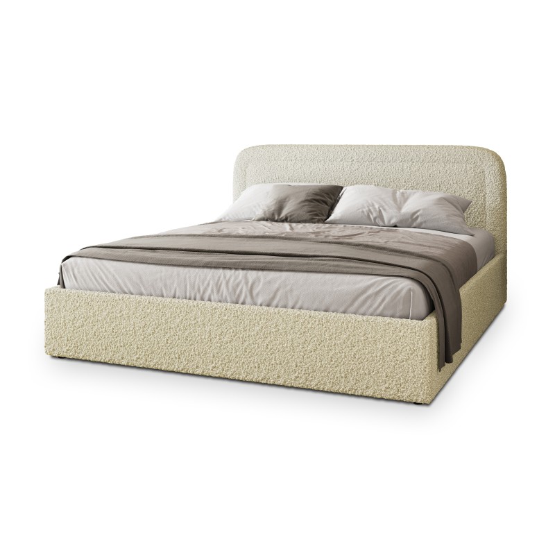 Model BENIRA został obity ekskluzywną tkaniną QUELLE, która wyróżnia się niepowtarzalną strukturą typu boucle, potocznie nazywaną „barankiem”. Jej subtelna, puszysta faktura wprowadza do wnętrza aurę ciepła, miękkości i wyrafinowania. Ten rodzaj materiału znakomicie komponuje się zarówno z wystrojem klasycznym, jak i nowoczesnym, podkreślając uniwersalny charakter łóżka. Dodatkowo, dzięki wysokiej odporności na ścieranie, tkanina długo zachowuje swój oryginalny wygląd, oferując trwałość i komfort użytkowania przez lata.