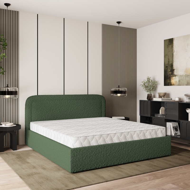 Model BENIRA został obity ekskluzywną tkaniną QUELLE, która wyróżnia się niepowtarzalną strukturą typu boucle, potocznie nazywaną „barankiem”. Jej subtelna, puszysta faktura wprowadza do wnętrza aurę ciepła, miękkości i wyrafinowania. Ten rodzaj materiału znakomicie komponuje się zarówno z wystrojem klasycznym, jak i nowoczesnym, podkreślając uniwersalny charakter łóżka. Dodatkowo, dzięki wysokiej odporności na ścieranie, tkanina długo zachowuje swój oryginalny wygląd, oferując trwałość i komfort użytkowania przez lata.