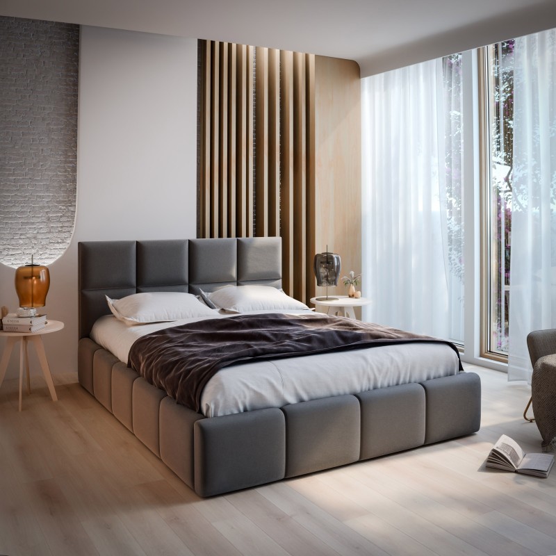 To nie tylko miejsce do snu, ale również mebel, który podkreśli elegancję i styl Twojej przestrzeni sypialnianej. To niezwykle atrakcyjne łóżko wyróżnia się prostokątnymi panelami, nadającymi mu nowoczesny charakter, a jednocześnie wprowadzając harmonię i równowagę do Twojej przestrzeni sypialnianej.