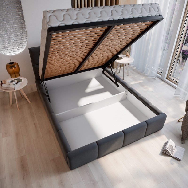 - W podstawowej cenie mebla znajduje się podnoszony stelaż z metalową ramą, wypełniają go elastyczne listwy. Taka opcja nie tylko wydłuża trwałość materaca, lecz także zapewnia większy komfort użytkowania i dodatkową przestrzeń do przechowywania pod łóżkiem.