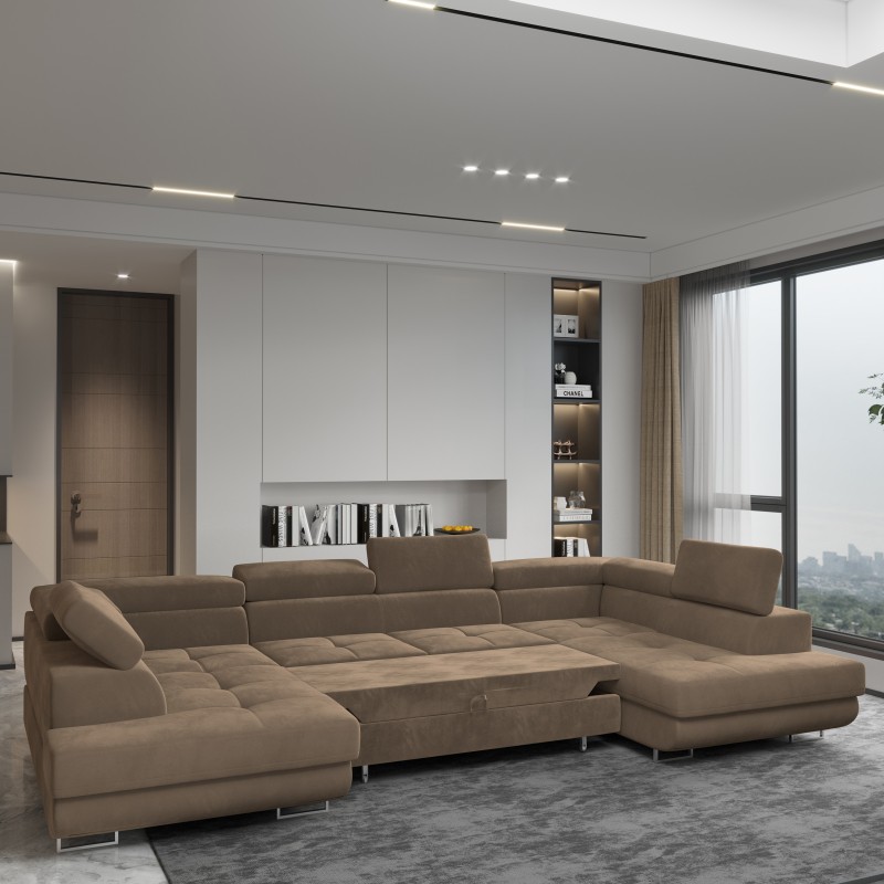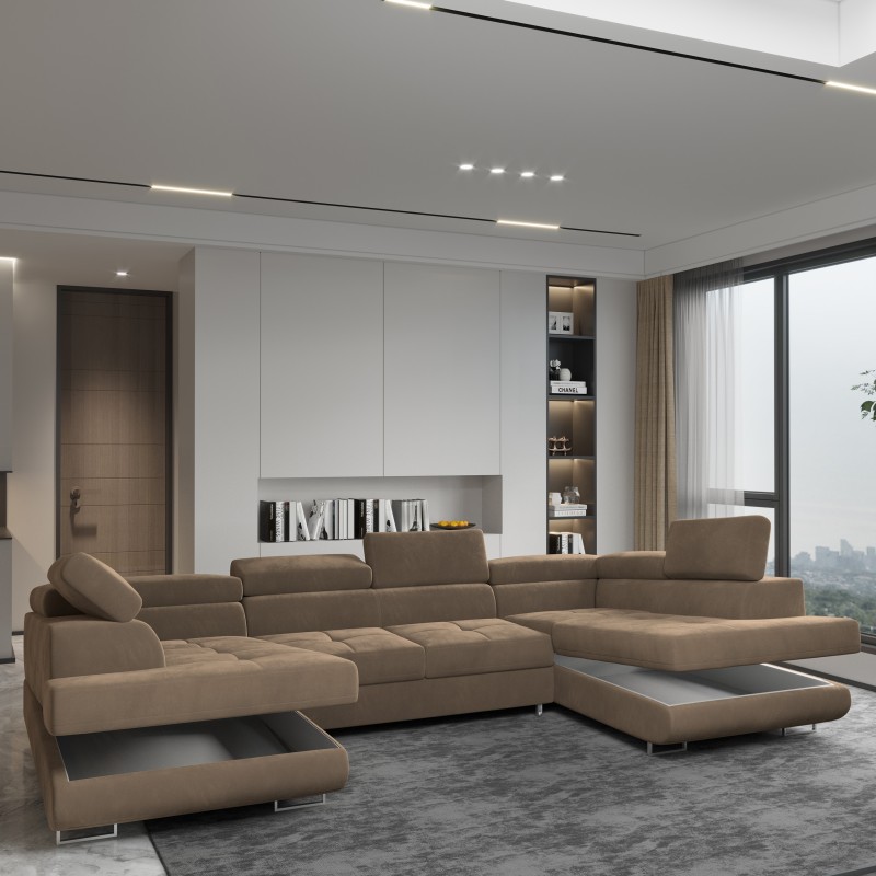 Poznaj RAGGIO – przestronny i elegancki nowoczesny narożnik do salonu, który został stworzony, by stać się sercem Twojego domu. Jego imponujące rozmiary i kształt litery „U” pozwalają na swobodny relaks całej rodzinie i gościom. To mebel, który harmonijnie łączy luksusowy design z wyjątkową funkcjonalnością, tworząc idealne miejsce do spędzania wspólnie czasu i celebrowania codziennych chwil.