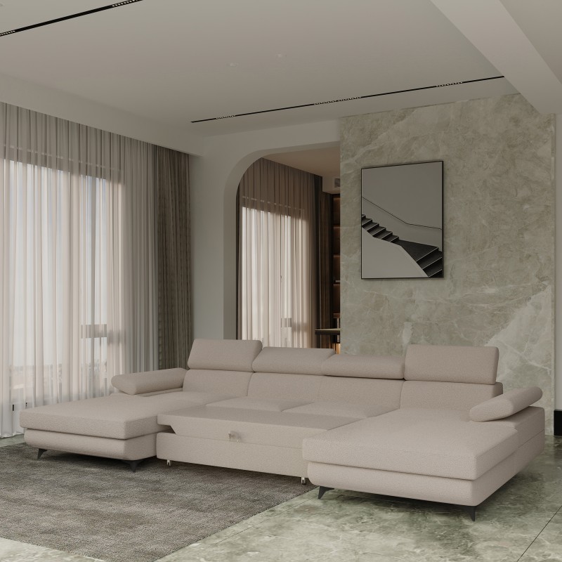- Przemyślane detale: Pojemnik na pościel schowany wewnątrz mebla pozwala na łatwe przechowywanie kołder i poduszek, utrzymując porządek w salonie bez zajmowania dodatkowego miejsca.