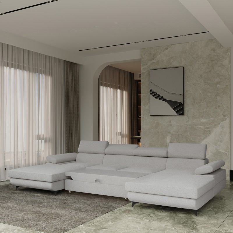 - Przemyślane detale: Pojemnik na pościel schowany wewnątrz mebla pozwala na łatwe przechowywanie kołder i poduszek, utrzymując porządek w salonie bez zajmowania dodatkowego miejsca.
