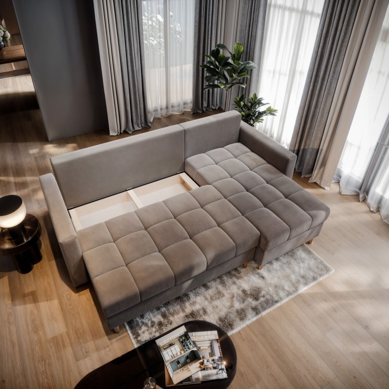 Dzięki funkcji spania, dostępnej o każdej porze dnia i nocy, narożnik MILO L stanie się również wygodnym miejscem do spania dla Ciebie i Twoich gości. Dodatkowo, wbudowany pojemnik na pościel pod siedziskiem pozwoli Ci zachować porządek w swoim mieszkaniu, zapewniając dodatkową przestrzeń do przechowywania.
