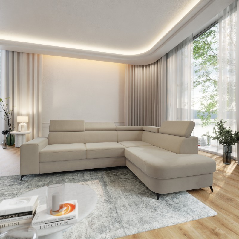 Masseno Narożnik ALVORO z funkcją spania i pojemnikiem na pościel Narozniki L, Rozkładana sofa - Beżowy, MATT VELVET 09