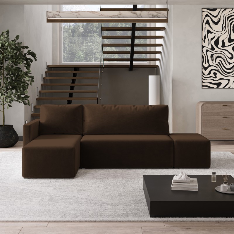 Masseno Narożnik VELOTTI z funkcją spania i pojemnikiem na pościel Narozniki L, Rozkładana sofa - Brązowy, KRONOS 06