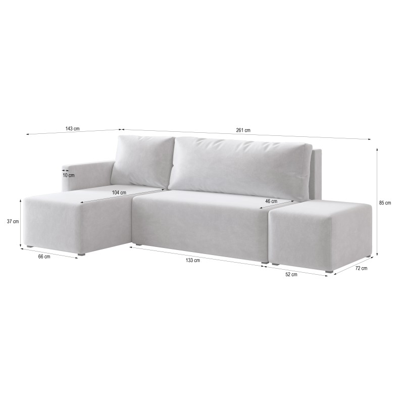 - Solidna konstrukcja z drewna i płyty wiórowej zapewnia stabilność i trwałość, a staranne wykończenie tyłu narożnika tkaniną umożliwia jego swobodne ustawienie na środku pokoju.