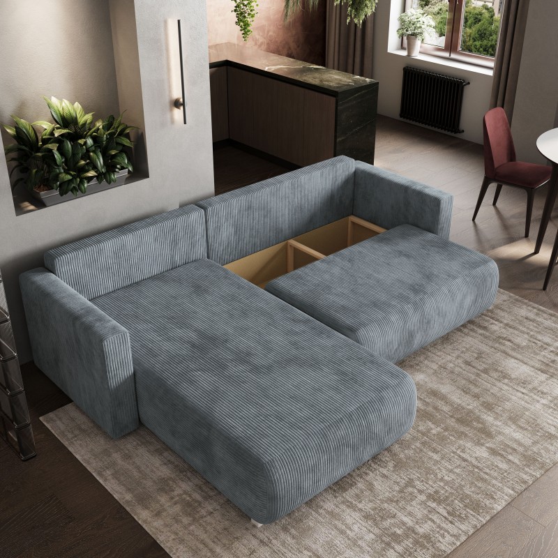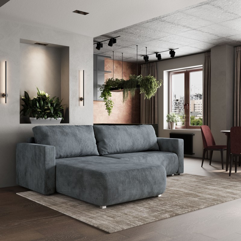 Nasza sofa narożna z obszerną otomaną jest prawdziwą oazą relaksu. Mebel wykonany z miękkiego sztruksu, nie tylko zachwyca wzornictwem, ale także gwarantuje trwałość i niezwykłą przyjemność dotyku.