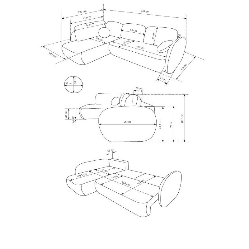 - Narożnik wolnostojący – tył obity jest tą samą tkaniną, dzięki czemu sofa może być elastycznie ustawiona w salonie.