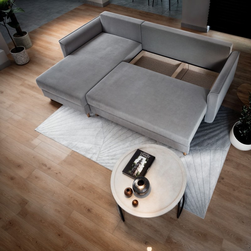 Jego charakterystyczne, wysokie nóżki o wysokości 8 cm dodają lekkości i elegancji, nadając mu wyrafinowanego charakteru, który subtelnie podkreśla każde wnętrze. Prosty montaż sprawia, że jest idealnym rozwiązaniem nie tylko do salonu, ale także jako wygodne miejsce do wypoczynku i relaksu. Dzięki funkcji spania, dostępnej w każdej chwili, narożnik PISAN staje się również doskonałym miejscem do noclegu dla Ciebie i Twoich gości. Dodatkowy schowek na pościel pod siedziskiem pozwala utrzymać porządek w mieszkaniu, zapewniając jednocześnie dodatkową przestrzeń do przechowywania.
