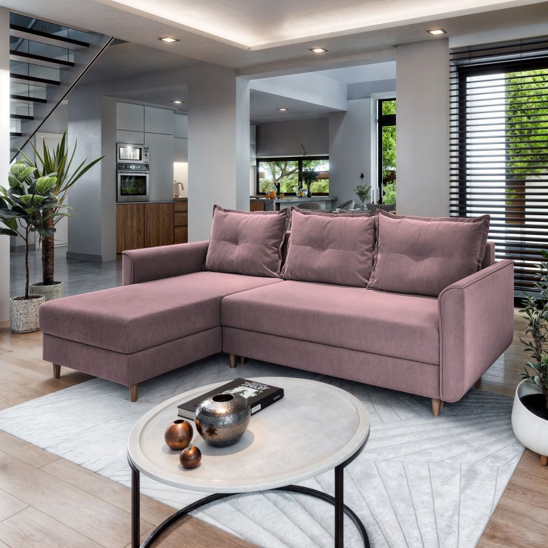 Masseno Narożnik PISAN z funkcją spania i pojemnikiem na pościel Narozniki L, Rozkładana sofa - Pudrowy róż, KRONOS 27