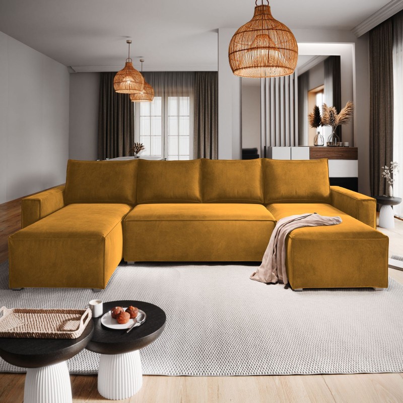 Narożnik DENI w kształcie litery "U" to synonim luksusu i wygody. Pokryty miękką, welurową tkaniną, która jest niezwykle przyjemna w dotyku, a jednocześnie wytrzymała i odporna na zaciągnięcia. Zwiększona wytrzymałość tkaniny idealnie sprawdzi się jeśli Twój czworonożny pupil lubi przebywać z Tobą na kanapie. Ważnym atutem jest powłoka hydrofobowa, przypadkowe rozlanie płynów nie jest problemem - łatwo utrzymasz go w czystości. Narożnik DENI jest rozkładany, dzięki funkcji spania szybko przekształca się w przestronne i wygodne łóżko, co sprawia, że jest idealny dla gości, których z łatwością przenocujesz. Dodatkowy pojemnik pod siedziskiem oferuje dużo miejsca na pościel, pomagając utrzymać porządek w salonie. Teraz zapasowa pościel czy zimowe buty zawsze będą miały swoje miejsce. Dzięki pełnemu obiciu tkaniną, narożnik DENI świetnie sprawdza się jako mebel wolnostojący. Może stanowić centralny punkt Twojego salonu, dodając mu nowoczesnego charakteru.