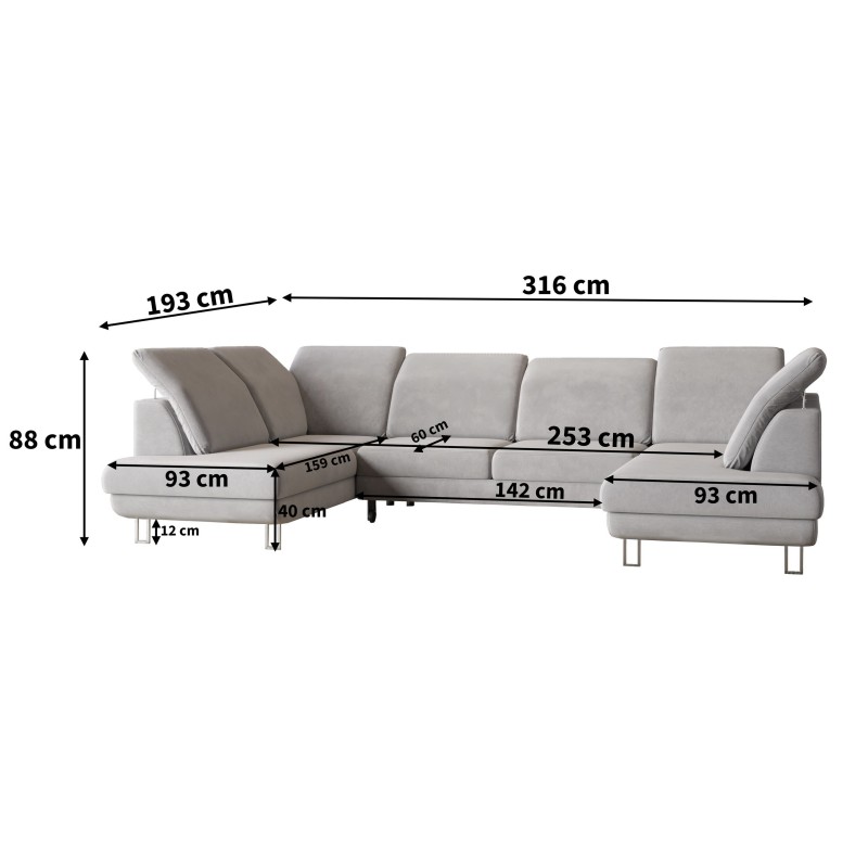 Konstrukcja narożnika TERAMO wyróżnia się nowoczesnym designem oraz regulowanymi zagłówkami zintegrowanymi z oparciem. To oznacza, że możesz łatwo dostosować ustawienie zagłówków dla maksymalnego komfortu podczas relaksu lub czytania. Pojemniki w podstawach łóżka są niezwykle praktycznym rozwiązaniem, które zapewnia dodatkowe miejsce na przechowywanie, idealne na pościel czy inne niezbędne rzeczy. Dodatkowo, wygodna funkcja spania sprawia, że narożnik TERAMO staje się doskonałą opcją do przenocowania gości, a także idealnym miejscem do zabaw dla dzieci. Wyposażony w sprężyny faliste, narożnik TERAMO gwarantuje nie tylko komfortowe wsparcie, ale również długowieczność i odporność na codzienne użytkowanie. Wysokie nóżki ułatwiają nie tylko sprzątanie, ale także korzystanie z odkurzaczy automatycznych, co zwiększa wygodę użytkowania narożnika w codziennym życiu. Obszerny narożnik u-kształtny zapewnia dużo miejsca dla całej rodziny, idealne na wspólne spotkania i relaks. Dzięki dużej ilości wygodnego miejsca każdy znajdzie dla siebie idealne miejsce do odpoczynku i relaksu.