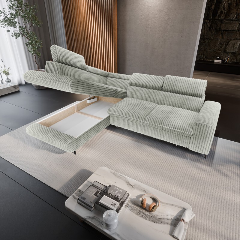 Jednym z kluczowych elementów tej rogówki jest otwierany pojemnik, który oferuje mnóstwo miejsca na przechowywanie pościeli, sezonowych ubrań czy butów. To praktyczne rozwiązanie sprawia, że Twój salon pozostanie zawsze schludny i uporządkowany, a wszystkie potrzebne przedmioty będą zawsze pod ręką. Usiądź wygodnie, dostosuj ustawienie zagłówka, skorzystaj z wygodnego podłokietnika i oddaj się pełnemu relaksowi, nie ważne czy będzie to podczas długich seansów filmowych czy leniwych wieczorów z książką. Dostosuj mebel do swoich potrzeb i ciesz się maksymalnym komfortem, który dopasuje się do Ciebie.