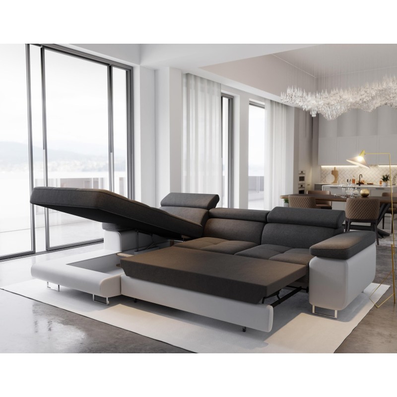 Regulowane zagłówki pozwolą dostosować narożnik do własnych preferencji. Wygody dodaje wykonanie siedziska z wykorzystaniem sprężyny falistej co jest szczególnie ważne podczas długich wieczorów spędzonych na relaksie i odpoczynku.
