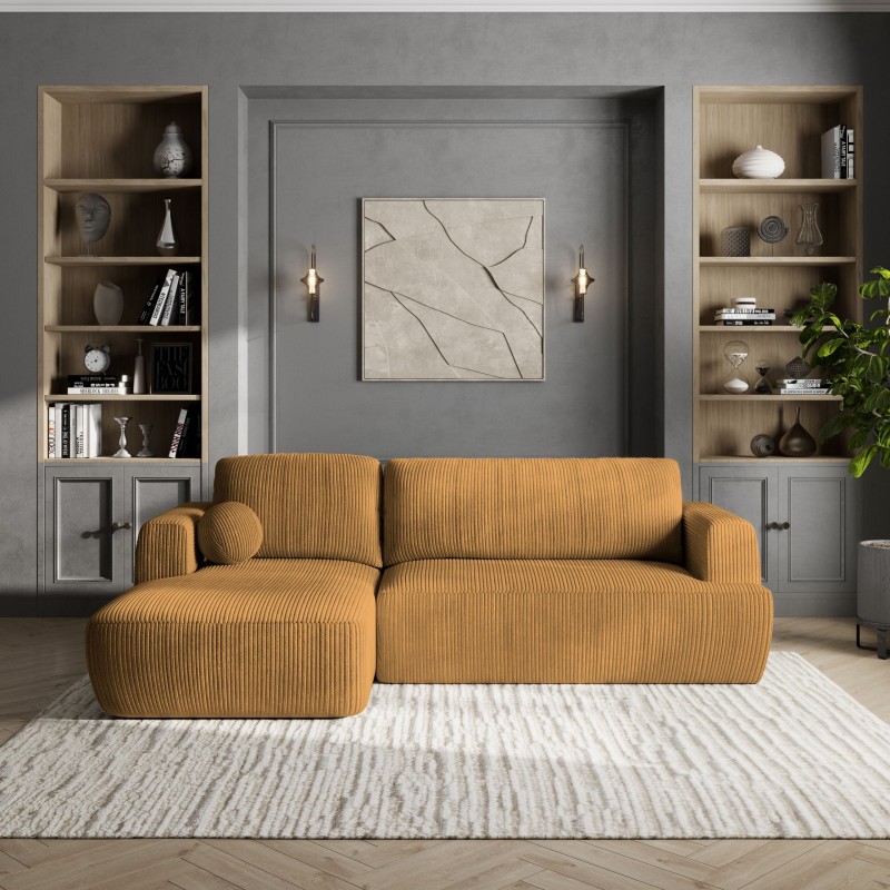 Dostępność w trzech wyjątkowych tkaninach pozwala dopasować narożnik do indywidualnych preferencji. Bukla - Now Or Never to miękkość i przytulność, sztruks - POSO dodaje strukturalnej elegancji, a velvet - Kronos wprowadza aksamitną gładkość i luksusowy wygląd.