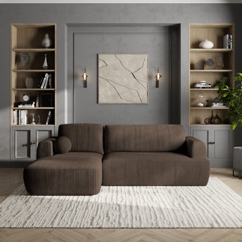 Dostępność w trzech wyjątkowych tkaninach pozwala dopasować narożnik do indywidualnych preferencji. Bukla - Now Or Never to miękkość i przytulność, sztruks - POSO dodaje strukturalnej elegancji, a velvet - Kronos wprowadza aksamitną gładkość i luksusowy wygląd.