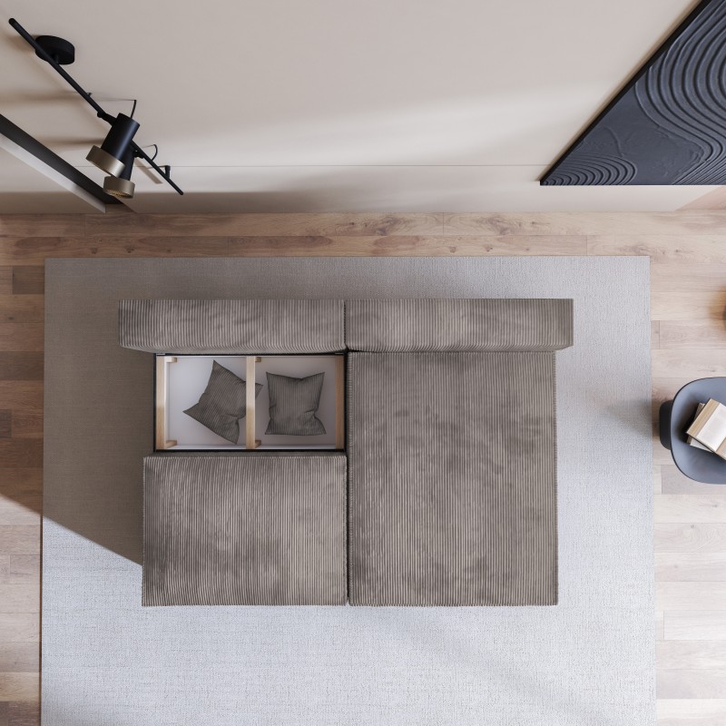 Pod wysuwanym siedziskiem znajduje się przestronny pojemnik, który pomieści pościel, koce i inne niezbędne akcesoria. Dzięki temu salon pozostaje uporządkowany, a wszystko, co potrzebne, jest zawsze pod ręką.