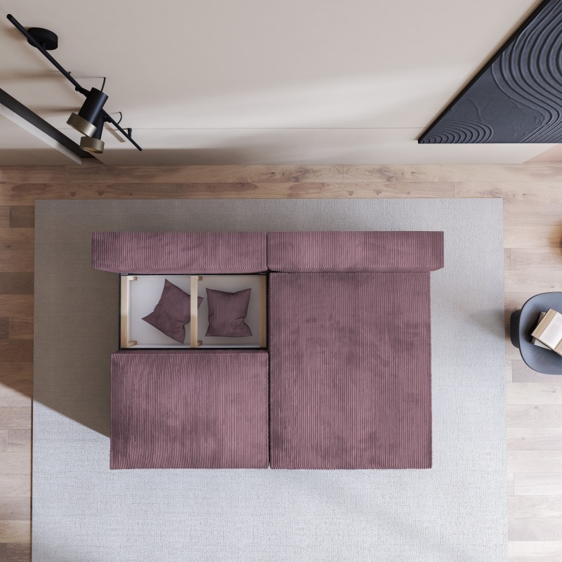 Pod wysuwanym siedziskiem znajduje się przestronny pojemnik, który pomieści pościel, koce i inne niezbędne akcesoria. Dzięki temu salon pozostaje uporządkowany, a wszystko, co potrzebne, jest zawsze pod ręką.
