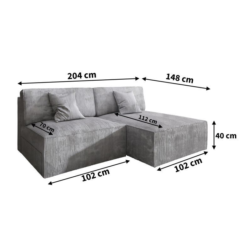 Pod wysuwanym siedziskiem znajduje się przestronny pojemnik, który pomieści pościel, koce i inne niezbędne akcesoria. Dzięki temu salon pozostaje uporządkowany, a wszystko, co potrzebne, jest zawsze pod ręką.