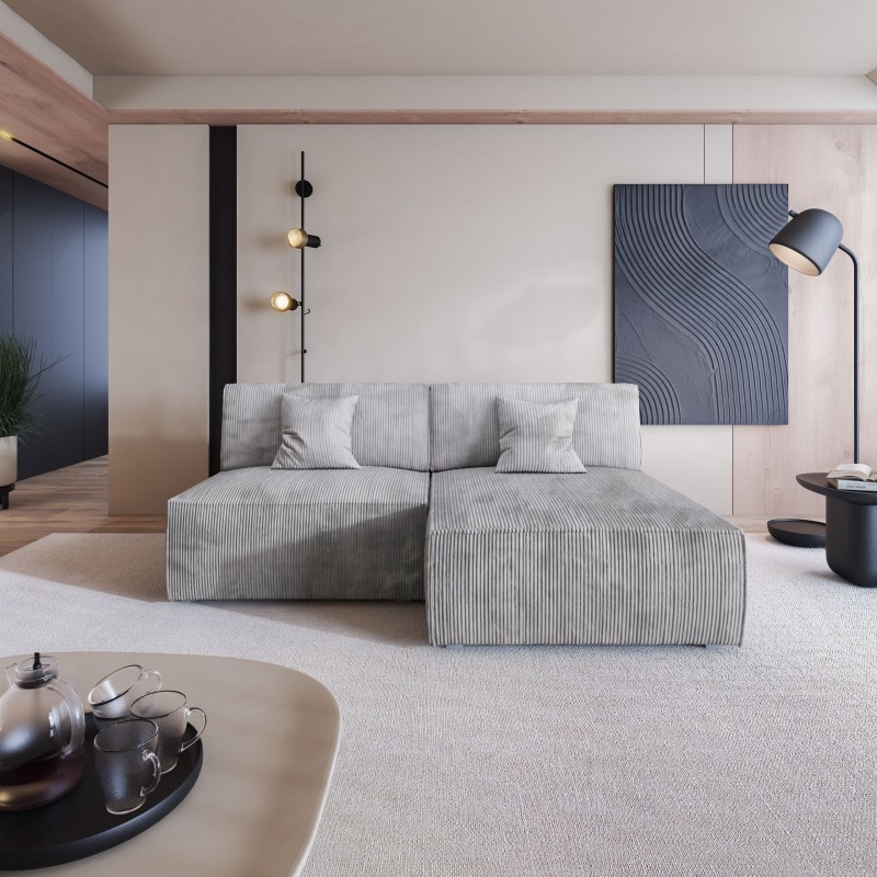Prosta, nowoczesna bryła w połączeniu z eleganckim sztruksem sprawia, że narożnik harmonijnie komponuje się z różnymi stylami wnętrz. Doskonale pasuje zarówno do minimalistycznych aranżacji, jak i przytulnych, skandynawskich przestrzeni.