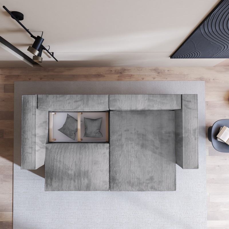 Pod siedziskiem znajduje się przestronny schowek, który pozwala przechować koce, poduszki czy inne niezbędne akcesoria. To praktyczne rozwiązanie pomaga utrzymać porządek w salonie bez zajmowania dodatkowej przestrzeni.