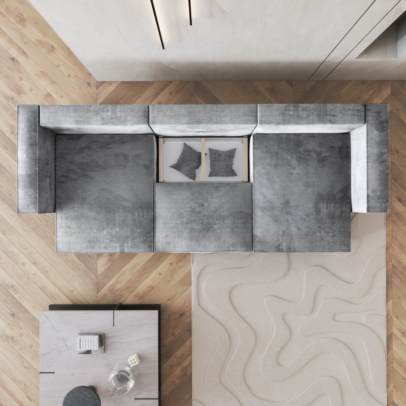 Miękka, welurowa tkanina Monolith otula ciało, dodając wnętrzu luksusowego charakteru i sprawiając, że każda chwila spędzona na narożniku staje się prawdziwą przyjemnością. Wieczorne seanse filmowe, leniwe poranki czy weekendowe spotkania ze znajomymi – SARMO pasuje do każdej okazji. Jego wolnostojąca konstrukcja sprawia, że świetnie prezentuje się zarówno przy ścianie, jak i na środku przestronnego salonu. A kiedy przychodzi pora na odpoczynek? Narożnik w kilka sekund zamienia się w wygodne łóżko, zapewniając komfortowy sen dla okazjonalnych gości. Praktyczny pojemnik na pościel pozwala schować koce i poduszki, pomagając utrzymać porządek.