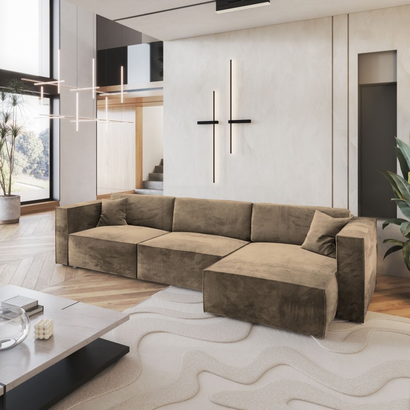 Aksamitna tkanina Monolith nadaje narożnikowi elegancki wygląd, a jednocześnie jest niezwykle praktyczna. Jest odporna na plamy i łatwa w czyszczeniu, co czyni ją idealnym wyborem dla rodzin z dziećmi lub zwierzętami.