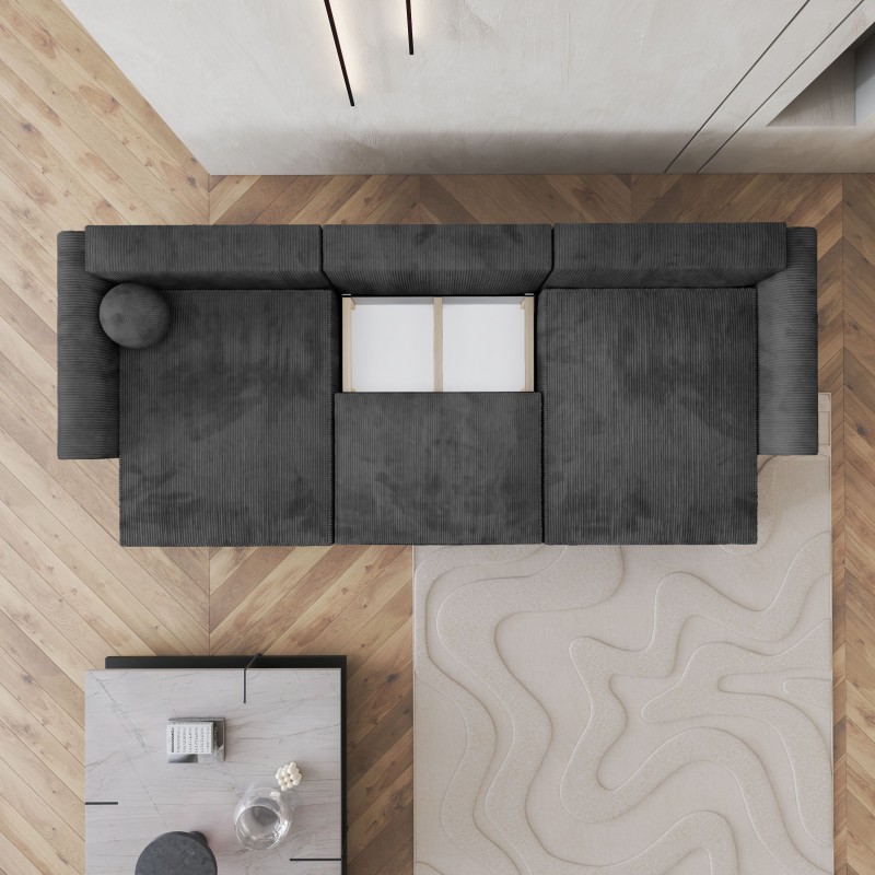 Tkanina POSO wyróżnia się charakterystyczną, prążkowaną strukturą sztruksu, która nie tylko wygląda stylowo, ale również zapewnia wyjątkową miękkość i przyjemne doznania w dotyku. FENTO świetnie sprawdzi się zarówno w nowoczesnych, jak i klasycznych wnętrzach, dodając im unikalnego charakteru. FENTO to nie tylko piękny wygląd, ale także maksymalna funkcjonalność. Funkcja spania pozwala w kilka chwil zamienić narożnik w wygodne łóżko, co czyni go idealnym rozwiązaniem dla gości. Pojemny schowek na pościel to praktyczny element, który ułatwia przechowywanie koców, poduszek i innych tekstyliów. Dodatkowym atutem jest designerska poduszka w kształcie kuli, która pełni zarówno funkcję dekoracyjną, jak i praktyczną – może służyć jako wsparcie dla odcinka lędźwiowego lub stanowić ozdobę wnętrza.